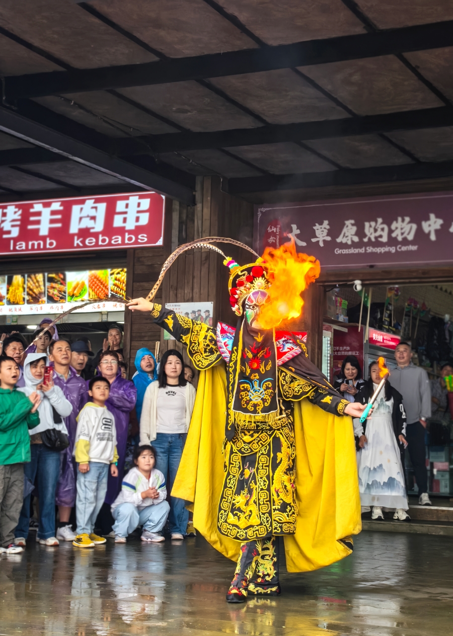 非遗展演区入口挂着 “非遗贺国庆” 横幅,川渝变脸艺人的 “九变” 绝技融入红色脸谱,变脸间隙比出 “国庆快乐” 手势;喷火表演时,火焰映着周边小国旗,引得孩童拽着家长蹦跳,艺人下台还为孩童贴国旗贴纸。