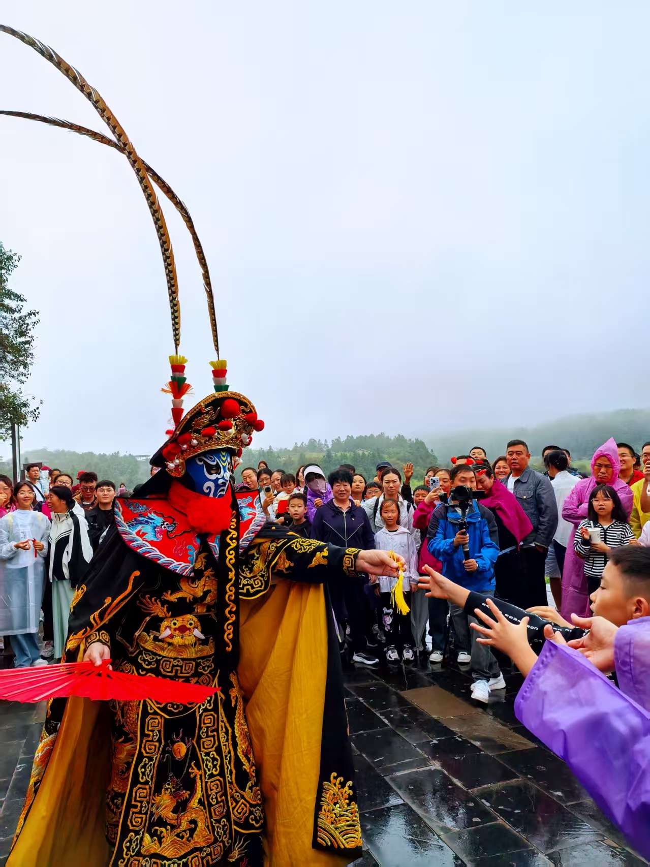 五大国潮活动成 “人气磁场”:仙女山景区,《丽人行》舞者刚谢幕,工作人员便摆出装满小国旗、“爱心” 贴纸、国旗发夹的礼品桌,孩子们围拢领取,成年人举旗与舞者同框,红旗下,草甸金黄与舞者朱红裙摆相映成趣。