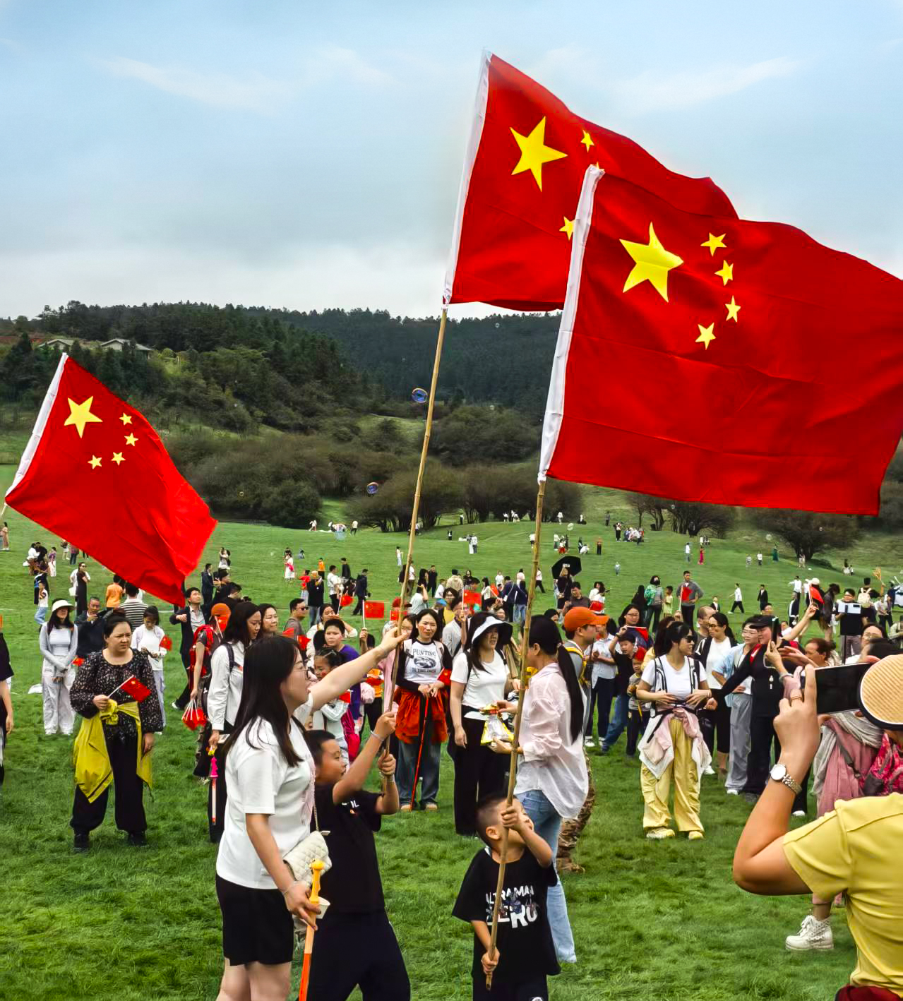 众人自发围拢,举小国旗同框,孩童在家长指引下喊出 “祖国万岁”;《我和我的祖国》歌声由少及多,嘹亮漫过草甸,与国旗猎猎声和鸣。