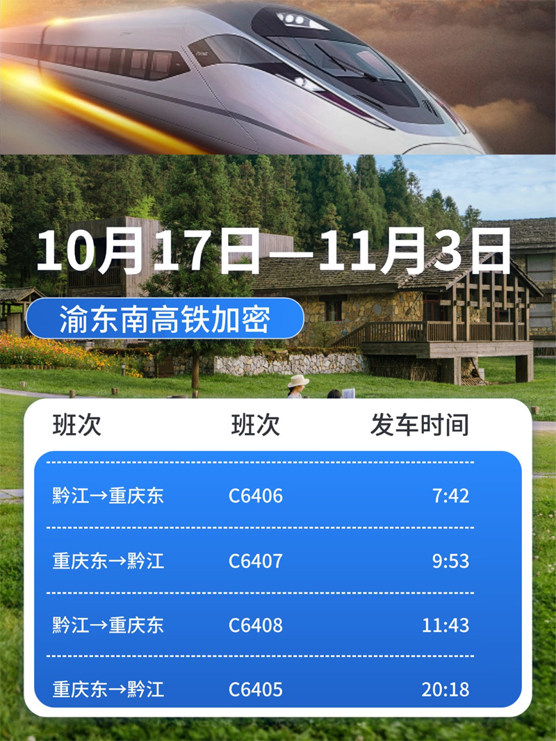 好消息!为精准满足渝东南区域旅客“通勤+文旅”双重出行需求,10月17日至11月3日期间,武隆与重庆主城间增开“两对四趟高铁”,进一步织密渝厦高铁沿线运输网络,让武隆旅游“快进慢游”体验再升级。