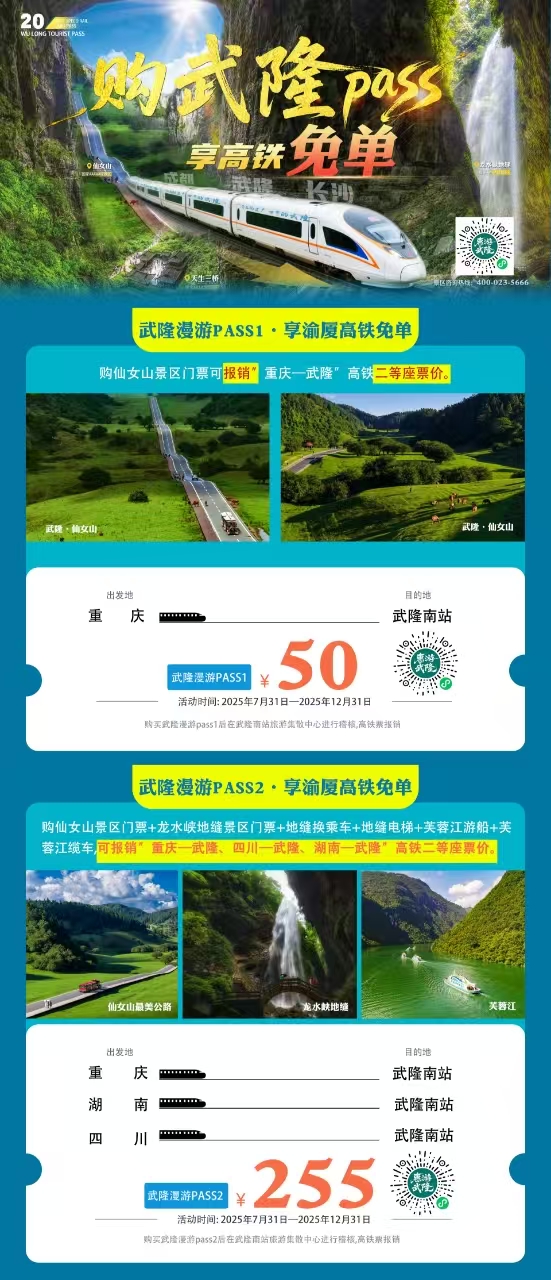 福利二:购买“仙女山+龙水峡地缝+芙蓉江”组合门票,可报销“重庆/四川/湖南-武隆”段高铁二等座票价。