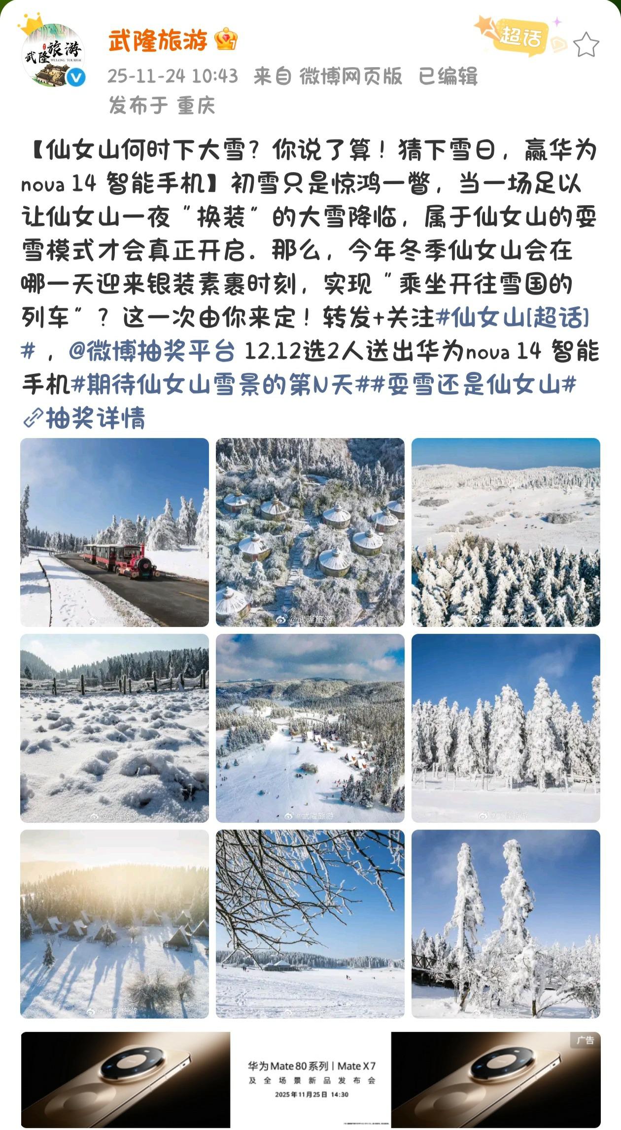 猜仙女山大雪日,赢华为nova 14!