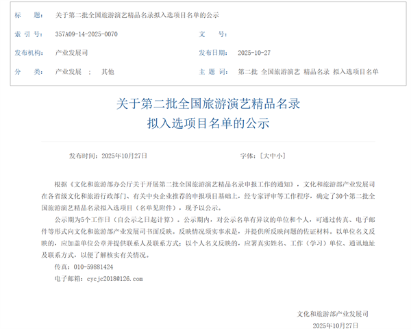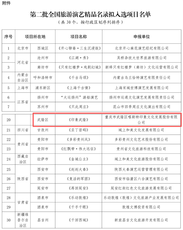 近日,文化和旅游部正式公布第二批全国旅游演艺精品名录,全国30个项目脱颖而出。其中,大型山水实景演出《印象武隆》凭借独特的文化内核与艺术魅力成功入选。