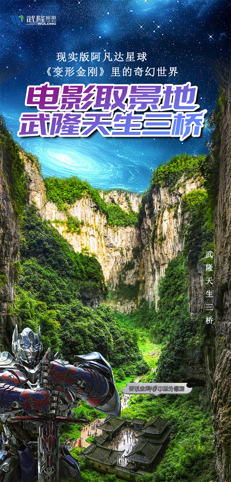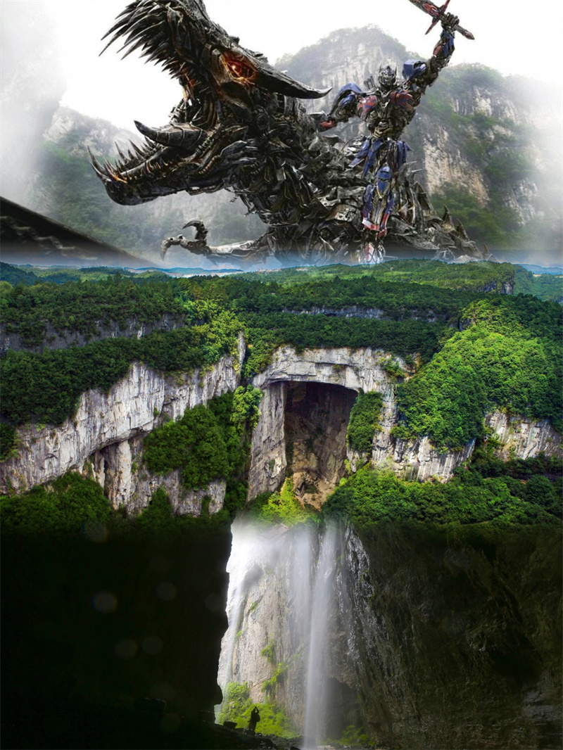 2014年,《变形金刚4:绝迹重生》全球热映,当镜头掠过“天生三桥”的天龙桥时,观众惊呼声四起:那座横跨天坑的天然石拱,竟成了汽车人与霸天虎的战场!剧组耗时3个月搭建特效棚,却舍不得删减天生三桥的原生镜头——1000米深的天龙天坑、200米高的石拱跨度,比电影特效更震撼的是大自然的鬼斧神工。