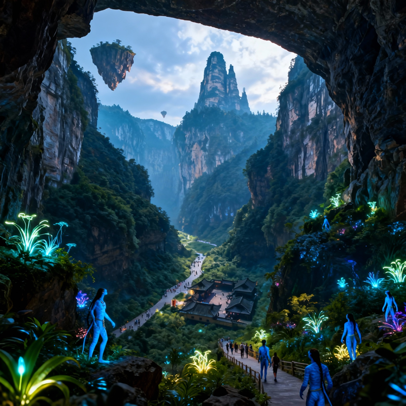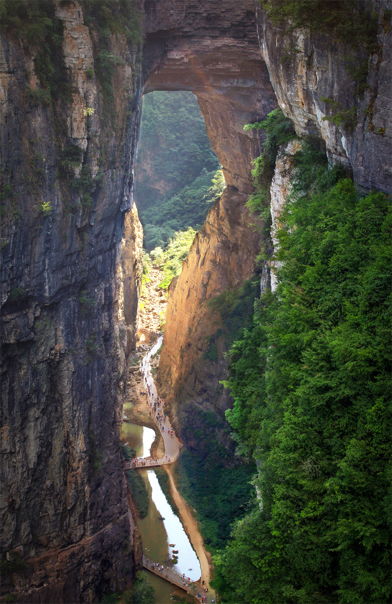 站在天坑底部抬头望,天龙桥像一条巨龙横亘天际,阳光从桥洞漏下形成“一线天”,崖壁上的蕨类植物爬满石缝,恍惚间竟像《阿凡达》里悬浮山的雏形。难怪导演迈克尔·贝说:“这里不需要绿幕,天生就是科幻片的天然片场。”