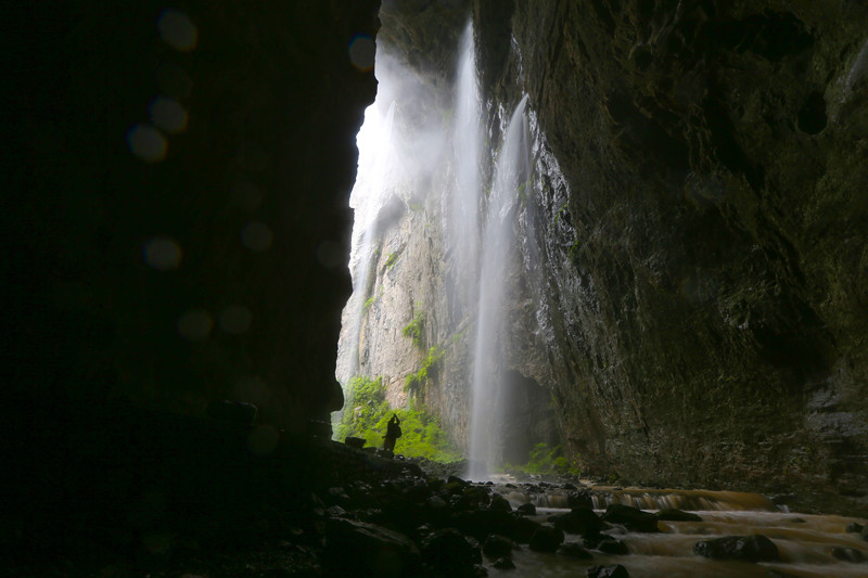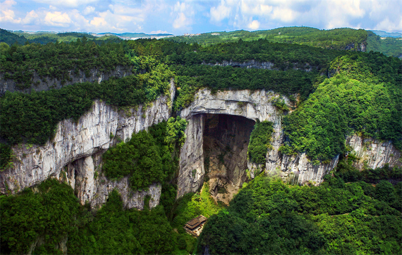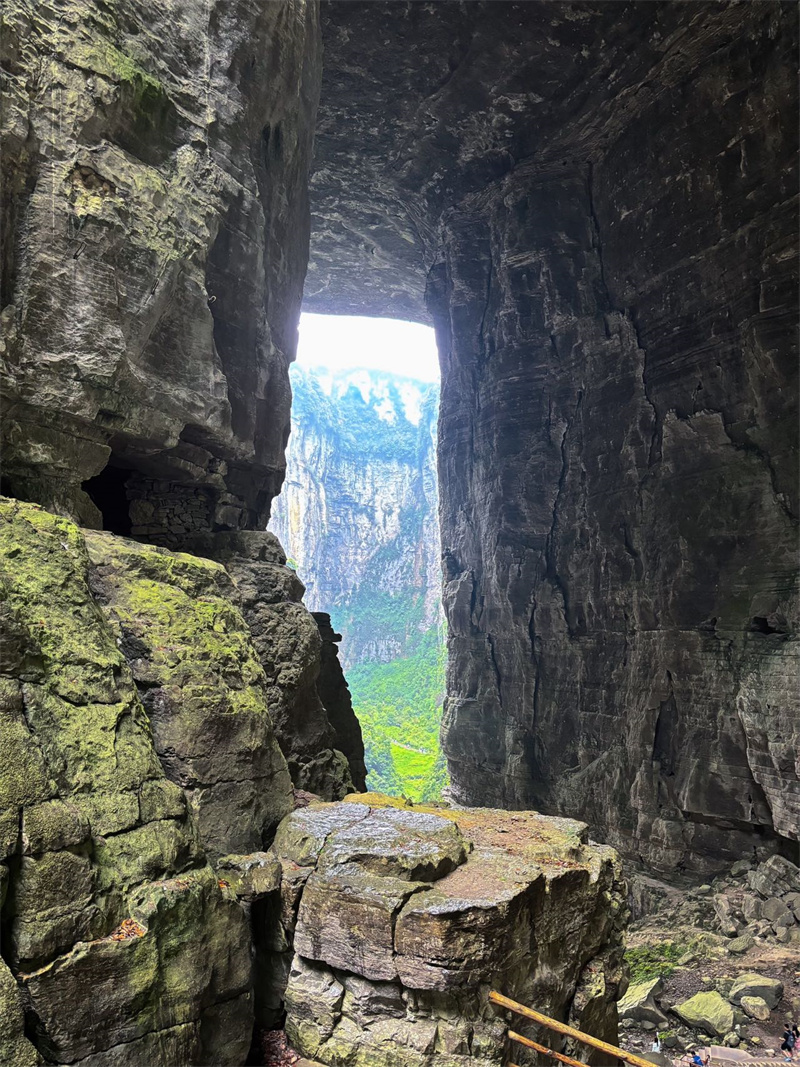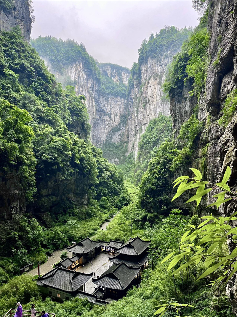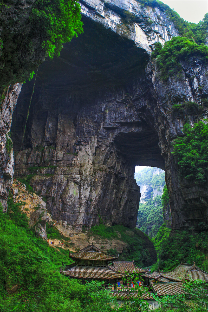 沿着步道深入天坑,崖壁上的“龙泉飞瀑”从黑龙桥顶倾泻而下,水雾在阳光中折射出彩虹;坑底的“龙泉客栈”(《满城尽带黄金甲》取景地)青瓦木梁,与石拱相映成趣。更妙的是清晨的“云海天坑”,云雾从坑底升起,缠绕着石拱,仿佛整个世界都悬浮在半空——这哪里是地球景观,分明是阿凡达的“哈利路亚山”降落在了重庆。