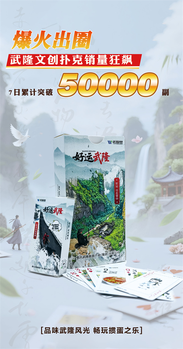 在文创产品的海洋中,武隆文创又双叒叕火啦!其中,武隆文创扑克正掀起一股热潮。自12月12日正式售卖以来,销量一路狂飙,短短7天时间累计突破5万副,成功爆火出圈!
