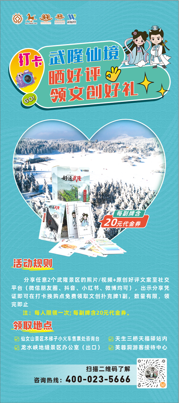如今,武隆文创扑克已成为武隆旅游的一张亮丽名片。它不仅为当地文创产业的发展注入了强大动力,而且让更多人通过这小小的扑克,认识武隆、爱上武隆。现在打卡武隆仙境,还有惊喜活动等你来参与,只要晒好评,就能领取文创好礼!