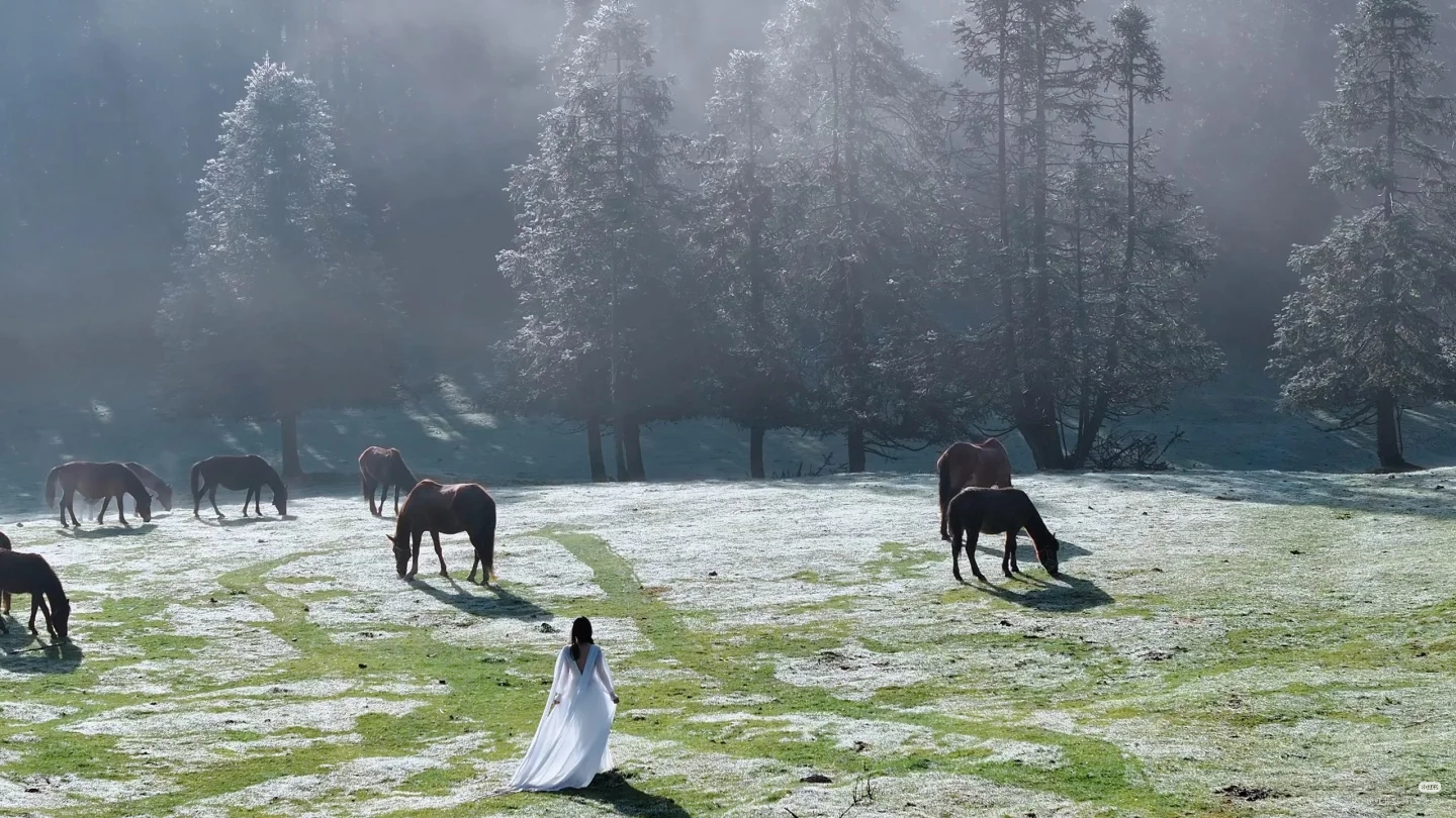 马群在雾凇与雪原间漫步,宛如行走的国画。