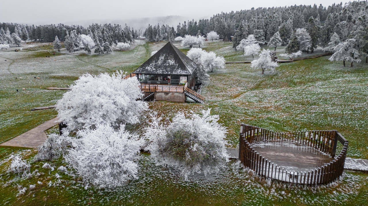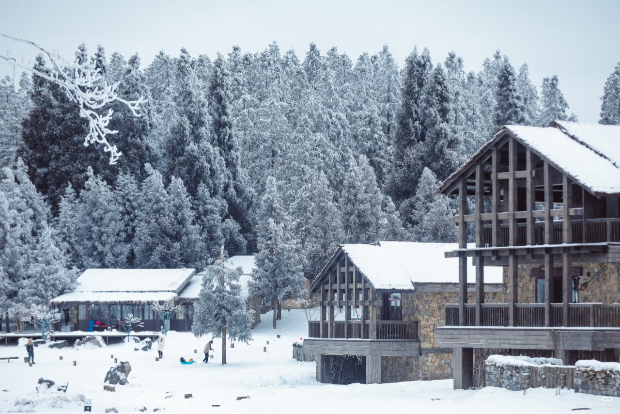 木屋的尖顶、蜿蜒的栈道、静默的松枝,都被覆上柔软而诗意的轮廓。