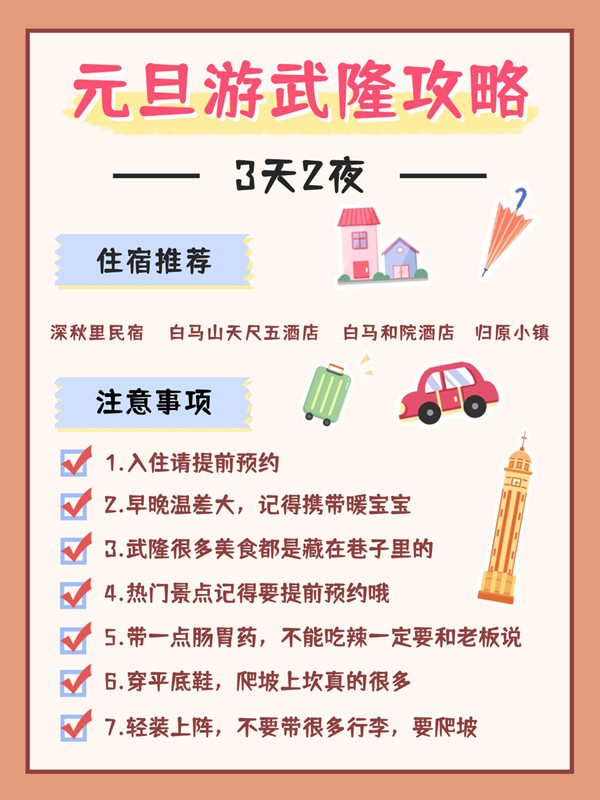 元旦将至,还在纠结去哪里跨年吗?别再盲目瞎跑啦!来武隆开启一场轻松惬意的3天2夜「躺平式」之旅吧,吃、住、行…全为你安排得明明白白,赶紧收藏起来!