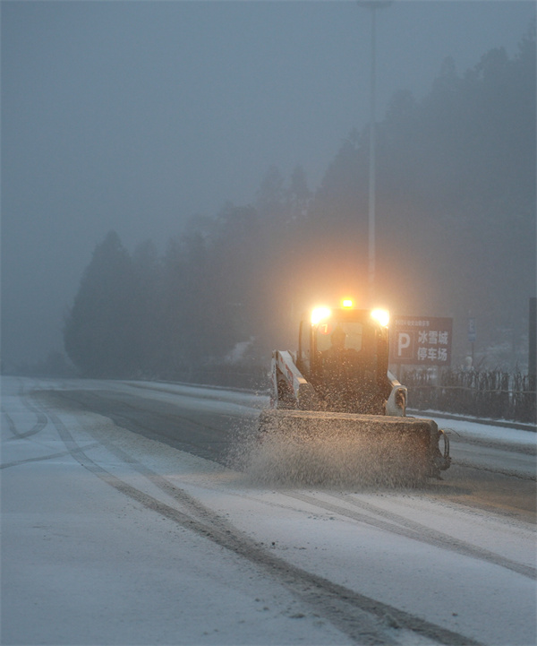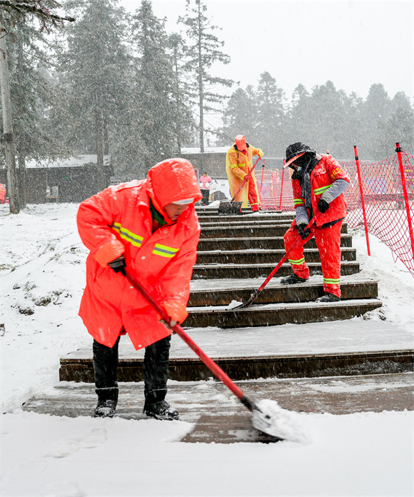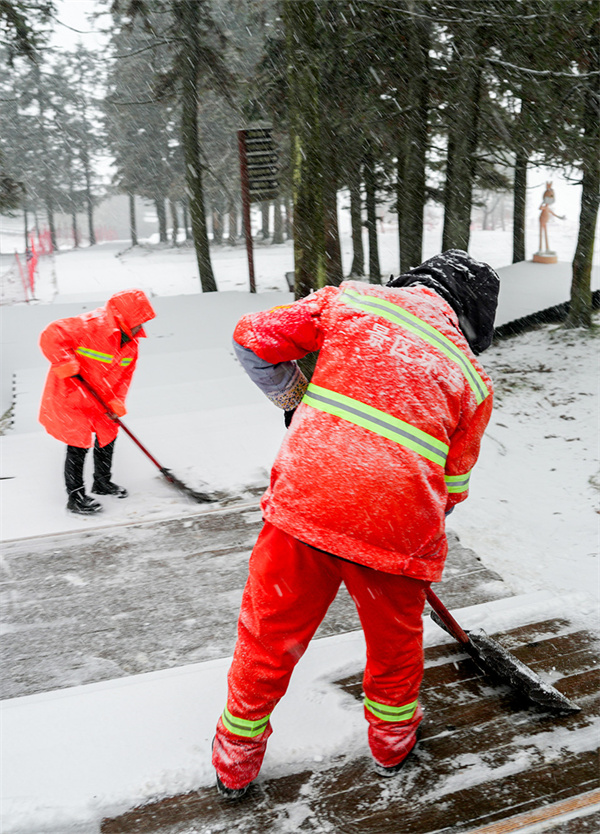 清晨,景区工作人员早早便开始了除雪作业,他们排除万难,连夜除雪、清扫道路,确保游客的出行安全。尽管气温极低,但大家干劲十足,现场热火朝天。经过数小时的努力,景区内的主干道和步行道畅通,为车辆和行人的通行创造了良好条件。