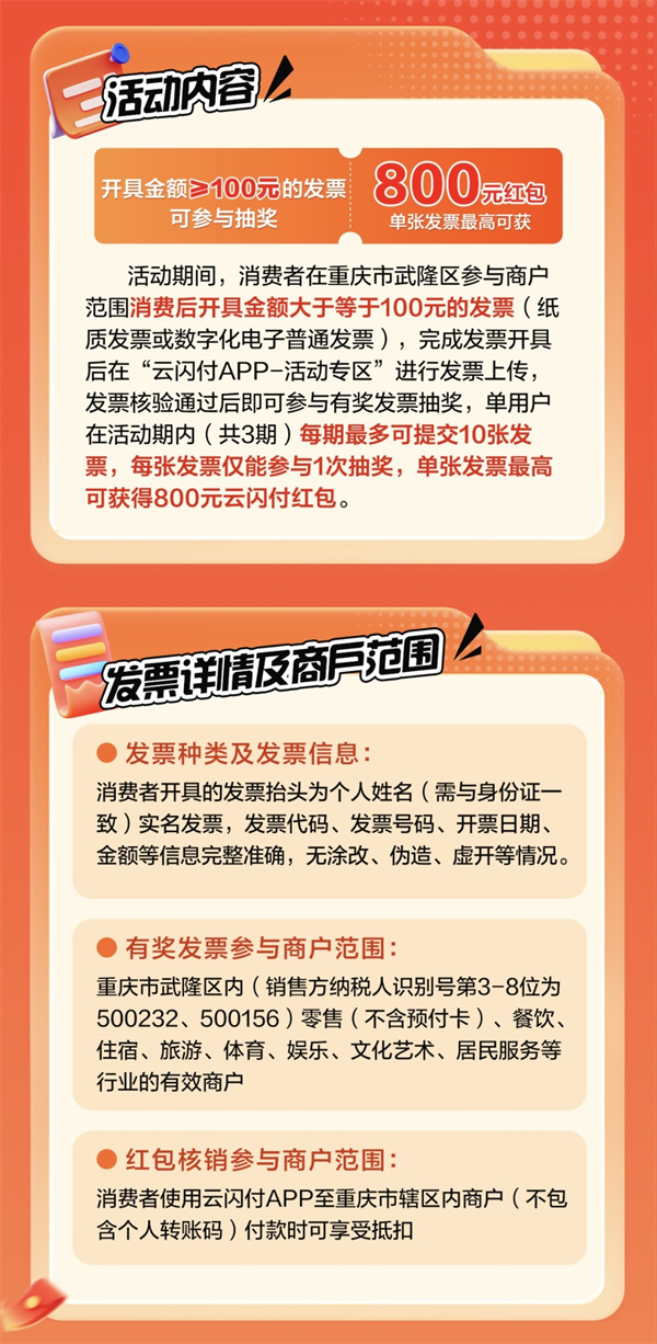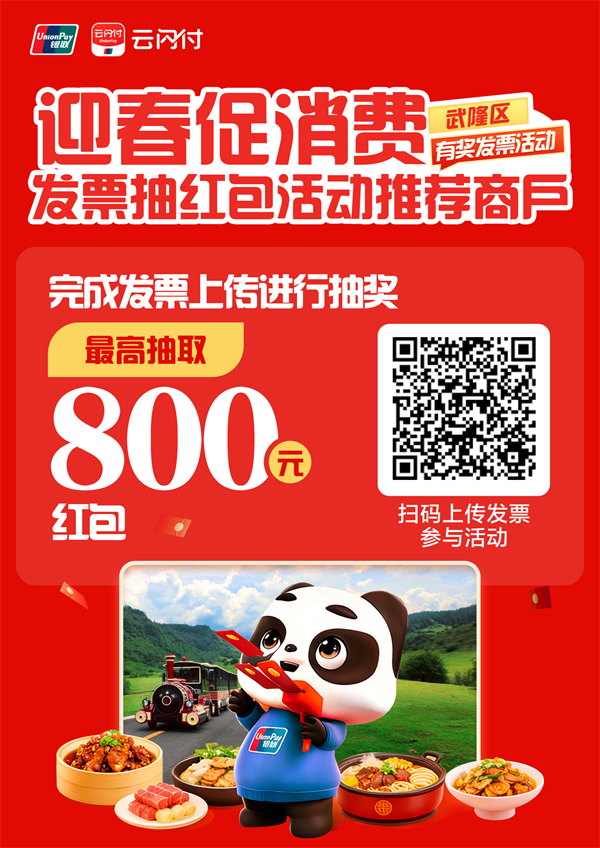消费满100元并开具实名制普通发票,通过云闪付APP上传即可参与。奖金自动发放至云闪付账户,在武隆全区支持云闪付的商户均可直接抵扣消费,畅快“薅羊毛”!