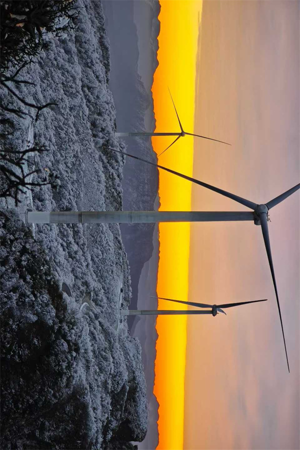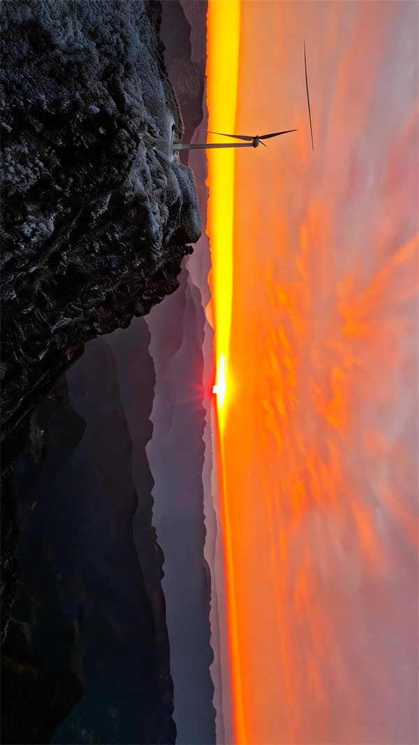 雪后初晴,立于山巅,看金色光芒刺破云海,将风车、雪原染上瑰丽色彩,场面震撼人心。