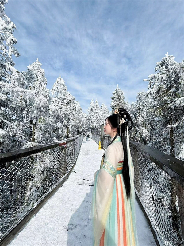 树顶漫步:站在观景台上,身着古装,背后是连绵的雪山和茫茫的林海雪原,震撼的场景非常适合拍照。