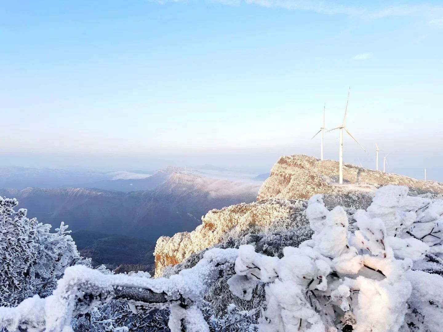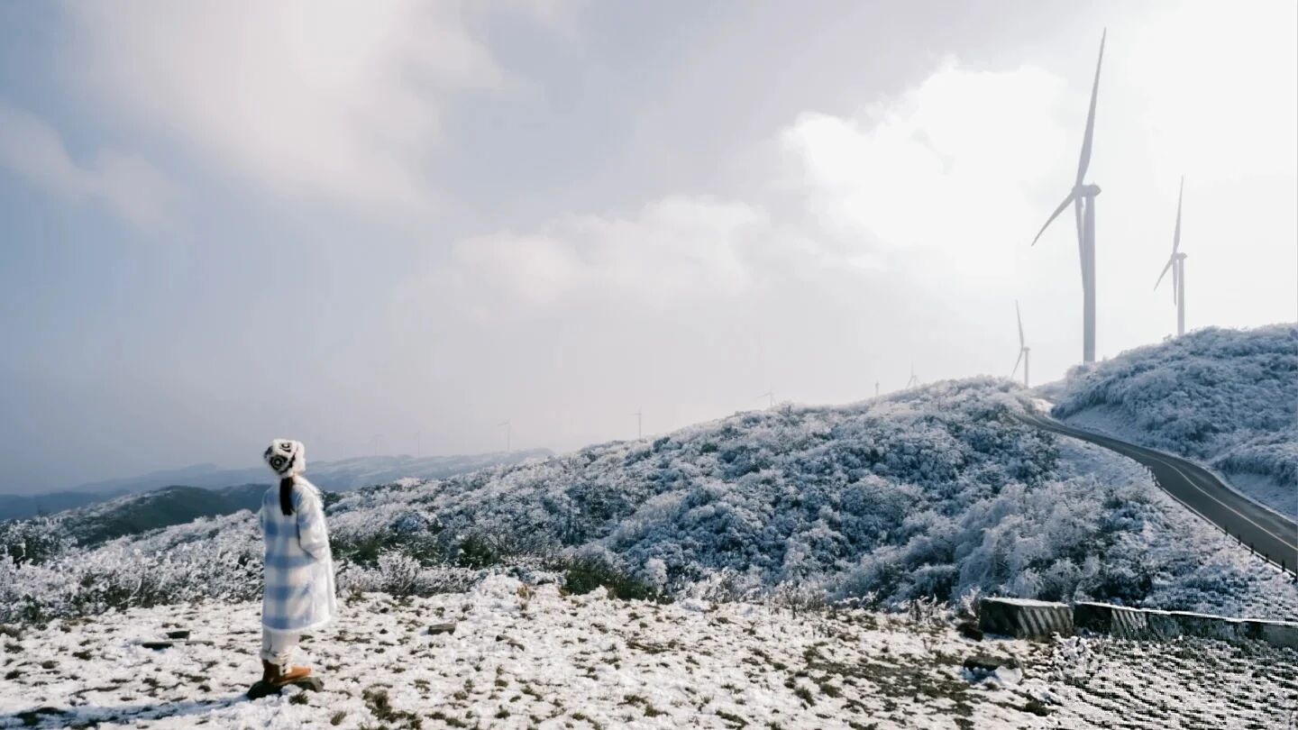 相比仙女山的名声在外,罩云山更像是一位深藏闺中的冰雪美人。这里海拔更高(1948米),雪期更长,雪质更纯净。最独特的是,数十座巨型白色风车沿山脊矗立,在雪原上构成了一幅极具视觉冲击力的现代画卷。