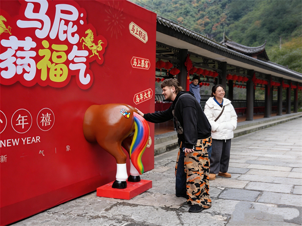 送福:卡通萌马与财神爷巡游派福,欢呼声此起彼伏。芙蓉洞转运大转盘前人头攒动,非遗年味坊里写春联、剪窗花围坐一堂。不少外国友人也入乡随俗,大家争相摸摸“马屁股”,讨个“马上有福”的好彩头,欢声笑语中把满满福气带回家。