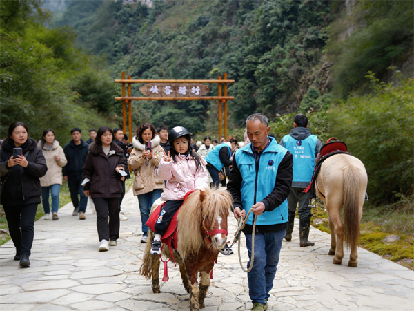 天生三桥“峡谷骑行”:游客骑着骏马穿行在亿万年形成的天坑幽谷之间,于壮阔山水中定格“一马当先”的英姿。