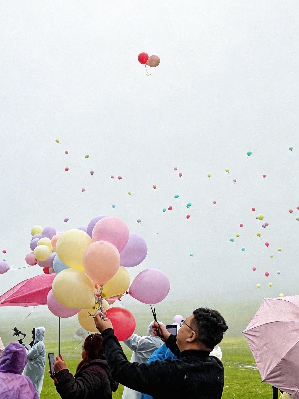 三点零八分,草原上上演最浪漫的一幕——千只可降解气球同时升空,载着心愿卡上写下的期许与告白,飞向天空。