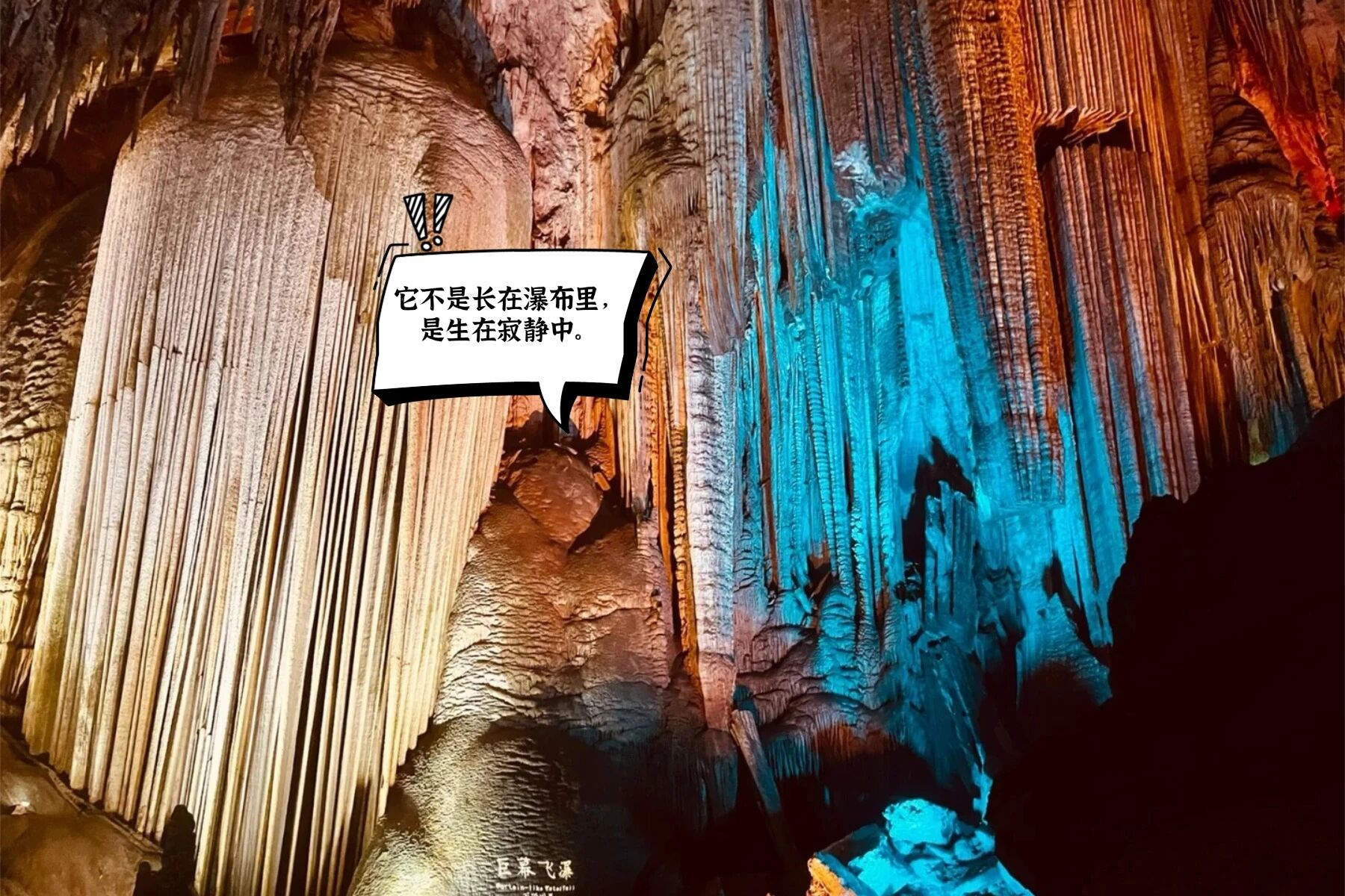 左边石幕如舞台丝绒,垂如帘、匀如丝、洁如玉;右边石瀑则似滔天巨浪被瞬间冻结,无数晶莹的石条倾泻而下。这不是水,却比水更震撼——它是大自然用石头雕刻的永恒瞬间。